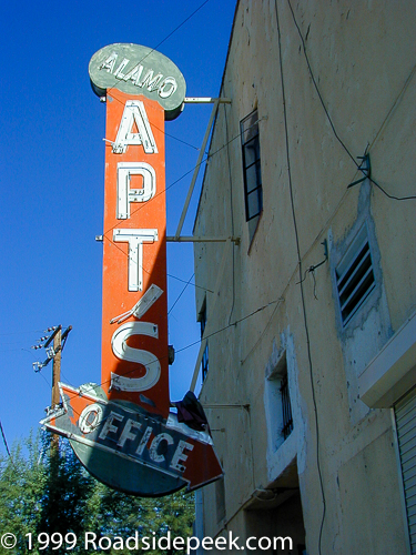 This colorful blade sign sits outside of the Alamo Apartments building in Tucson, AZ. The lettering is neon. Not sure if this was once a motel prior to be converted to apartments.