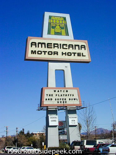 Check out the Americana Motor Hotel located near the United States and Mexico border in Nogales, AZ. The motel still survives 25 years later and however the sign has been adapted as the motel is now called Quality Hotel Americana. 06-23