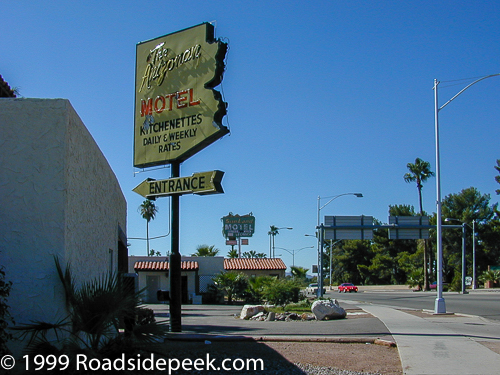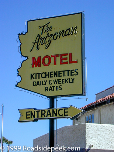Check out The Arizonan Motel located in Tucson. The Arizonan is located on the edge of the Miracle Mile as you get close to Oracle Rd. The sign advertises quite prominently kitchenettes and daily and weekly rates to its guests. The sign was constructed in 1951 when the motel was known as Canyon State Motor Lodge. In the 1970s, the motel itself became The Arizonan Motel.
