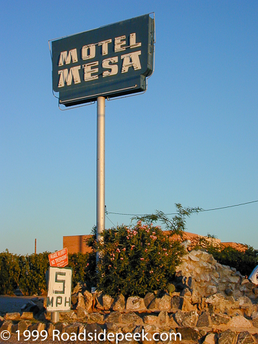 The sign for the Mesa Motel sticks up tall alongside the road in Tucson, AZ. The Mesa Motel was found along the Old Benson Highway. The motel is now gone and replaced with what's called the Wagon Wheel Efficiency Apartments. 06-23