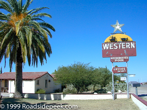 The Western Motel is and was located along the Old Benson Highway which was one of the main routes through Tucson. The Western Motel sign was pretty weather beaten back in the 1990s, however it still featured signage for kitchenettes and pools which used to be in high demand back in the day. Well, 25 years later the sign is still there though even more faded and beaten down. 06-23