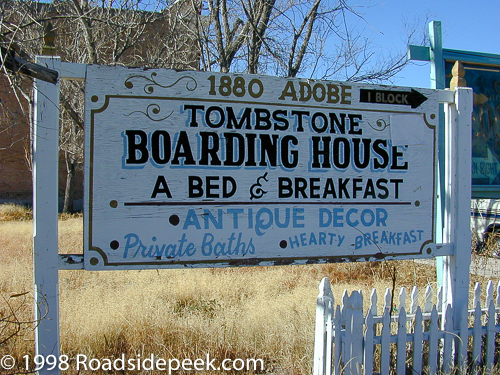 The Tombstone Boarding House was known as the Barrows Boarding House. The house is made of adobe and was built in 1880 by Tombstone's first bank manager. The house was enlarged in the 1930s and is a bed and breakfast.