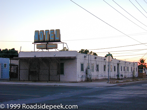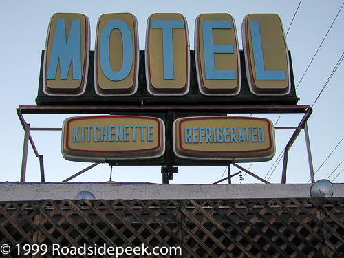 Here's the Fifth Avenue Motel just off the main highway in Yuma, Arizona. The Fifth Avenue featured an classic mid-century letter panel highlighting the words motel as well as kitchenette and refrigerated which were features around the 70s. The motel is closed, the lettering, gone and all that is left now is a bleached white building. 06-23