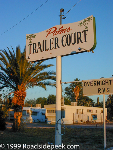 The Palms Trailer Park is located on Benson HighwSay. This sign and trailer park was one of many located on the old highway which is U.S. 80. Interstate 10 was built over a good portion of the Benson Highway, however there is still a segment east of Tucson that is still around. 06-23