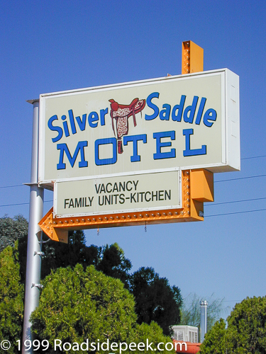 The Silver Saddle Motel is another of the old Tucson motor courts that used to dot the city. The sign here adverstised its family units and kitchen in very simple font.
