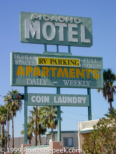 Travel along the I-10 about 20 years ago, you couldn't help but notice the huge sign off the freeway pointing the way towards the Picacho Motel. This was once of the largest signs I've seen on the road. The motel also featured a sign outside of the motel and converted apartments.