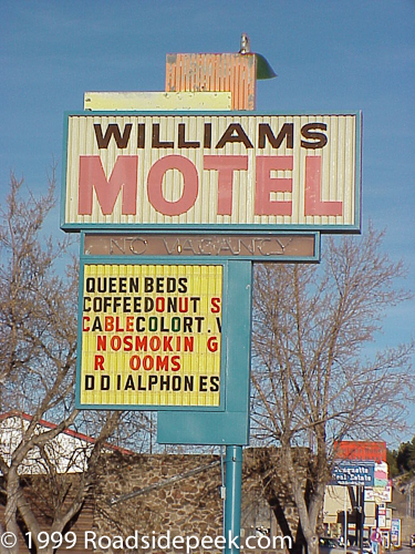 Here is the sign for the Williams Motel. The sign advertises some goodies including coffee and donuts, cable color TV, and non smoking rooms. 09-21