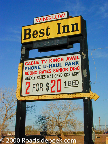 Check out this sign for the Best Inn in Winslow, AZ. Not sure when this sign disappeared. The sign advertised a great del of 2 for $20 as well as a bunch of other amenities for travelers looking for a deal off of Route 66. 09-21