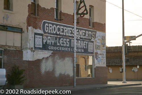 This building with the Pay Less Market sign on the side was built in 1909. This building once housed a hotel as well as the Pay Less Market Groceries and Meats. 06-23