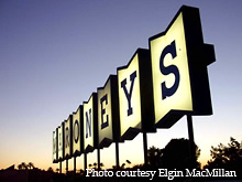 This multi-colored sign for the Melody Cleaners uses color to catch the eye of the passing motorist who may be interested in dry cleaning service one day. The Melody Cleaners dates back to 1940 and has won local awards over the years.