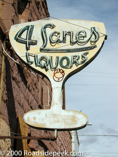 Here are a couple of shots of the 4 Lanes Liquors in Winslow, AZ. The cool marquee features a neon sign in the shape of a martini glass.