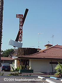 When in search for the Paul Bunyan and fiberglass "muffler" men statues in the late 1990s and early 2000s, a visit to Porterville turned up a double gem. Yes, it is the Bunyan Lodge featuring both Babe and the Blue Ox.