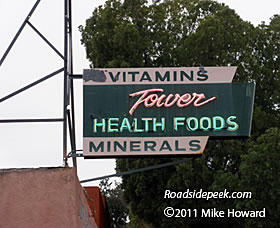 This health food shop and sign is located in Fresno, CA. The letters on the Tower Health Foods sign still light up. 07-11