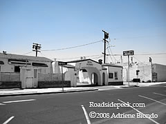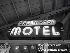 (Below)The Green Spot Motel in Barstow, CA, just off Route 66, is still open for business. The original marquee was replaced by a backlit plastic sign several years ago. Fortunately, the original sign was saved and is on display at the Route 66 Museum in Barstow. 05-08