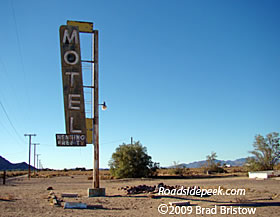 Well, another familiar roadside sight has just disappeared. After being declared a public nuisance by the Barstow City Council in March, the motel sign was removed from Main Street on April 22, 2010. According to the Desert Dispatch, the motel had been damaged by fire in 2006 and closed. 04-10