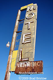 As you travel along Route 66, an faded motel marquee beckons in the desert light. The sign advertises the Henning Motel, which still appears to features intact motel rooms, unlike the the motel and cafe sign above. The Henning Motel is located across from the Bagdad Cafe from the movie of the same name and also frequently hosts film crews. 11-09