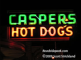 Here's a good look a the neon sign at the site of Caspers Hot Dogs in Hayward, CA. The dogs here must be good if the condition of the neon sign is any indication. 09-09