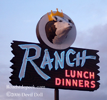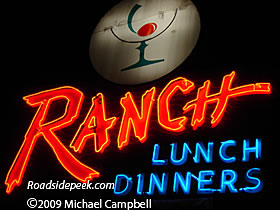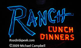 UPDATE 02-09 : Here are a couple of shots of the Ranch Restaurant sign taken in 2009 with the neon letters contrasting with a very dark night. The sign still shows off its two different sides with alternating blue and red neon colors.
