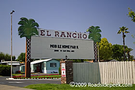 UPDATE 07/08 : The El Rancho marquee which survived the end of the drive-in in reincarnated form as a mobile home park welcome sign was removed in 2007. 07-08