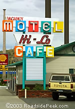 This multi-colored motel sign for the Hi-Lo Motel really