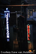 The neon blade for the Hotel Jefferson still lights