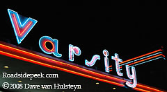 HIghway 40 in Davis, CA is home to the Varsity Theatre which features this neon marquee. The theatre was built and showed its first movie on June 9, 1950. In 1990, the Varsity closed down as crowds dwindled and began a life as a performing arts theatre. The Varsity owned by the City is currently used to show independent films. More information can be found here. 09-08