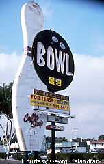 Here's a nice bowling alley that's still pretty much intact... and busy. Friendly Hills Bowl features a tall marquee.