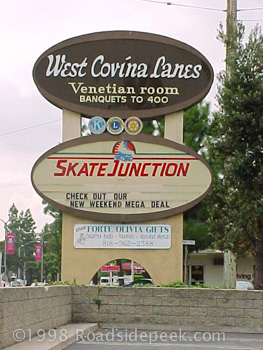 To the left is a look at the West Covina Lanes marquee. The alley also features a Skate Junction. 09-98