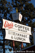 Lisa's Coffee Shop features an old style marquee and eye catching paint job on the restaurant