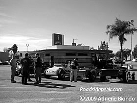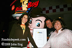 04.20.08 Downey, CA - From a first hand account, the 50th Anniversary Celebration was a success. The new owner of the coming Bob's Big Boy Jim Louder, Adriene Biondo Chair of the MODCOM, as well as many friendly folks from the Friends of Johnie's and locals joined in the celebration of both Johnie's 50th Anniversary and the recent good news that Bob's Big Boy has signed a long term lease. According to Bob's owner Jim Louder, every attempt will be made to keep as much of the huge landmark marquee intact while the change over to Bob's Big Boy signage is made.