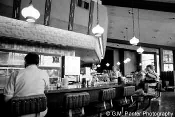 The lunch counter crowd dwindles during the day. A patron reads the daily