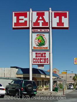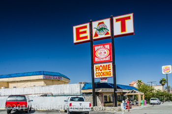 Travelers speeding near Palm Springs can't miss the "EAT" sign at the well known landmark The Wheel Inn Restaurant in Cabazon. Located next to the Cabazon Dinosaurs, The Wheel Inn has been a roadside establishment and diner like eatery with an Old West type of theme for more than 50 years. Movies have been filmed at this location, including a scene from Pee Wee's Big Adventure.