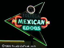 This neon sign for Tolteca features a tamale creatively places in the midst of a sign arrow. The first restaurant first opened in 1967 by BenArrietta Sr. The