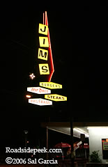 Jim's Burgers is a chain located in Southern California that features some interesting signage. Here's a night shot of the Jim's Burgers marquee in Downey, CA. 12-06