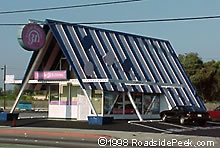 programmatic architecture delight is a real drive-thru donut joint featuring 26 foot tall donuts on each end of the structure, serving as end caps. The Donut Hole has been delighting San Gabriel Valley donut lovers for years.