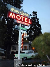 UPDATE 08/06 : For anyone wondering the latest on the old May Lane Motel /La Crescenta Motel, the name was changed but the style of the place and sign is just like you're back in time. It was sold again on March 2, 2006. The owners intend on bulldozing some time next year and putting in another shopping mall. Looks like this time it will happen. It is so sad and will be missed, This last of the old route 66 monuments should be preserved instead of torn down. It is no wonder that the movie industry are always filming at this site. This place is like stepping back in time and the landscaping is classic with old beautiful trees, which makes it hard to believe you're on Foothill Boulevard. To think that La Crescenta is willing to tear out the last bit of history and the beauty of those trees is a shame! Many