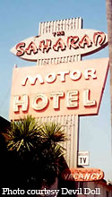 The Saharan Motel's sign stands tall along the busy boulevard.