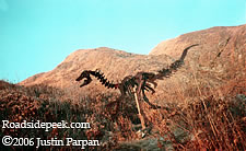 Closest to the highway, in a mess of tall weeds, a raptor stood ready for battle. Nearly the size of a man, it was constructed from intricately fit together pieces of particleboard, and held in place by a crude wooden stake. A rattlesnake had built a den in the nearby rocks, and quite appropriately, the sounds of the serpent’s angry rattling played in the hills like primal music.