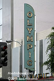 Here's a shot of the neon sign on the Olympic Theatre on Eight Street in Los Angeles. Since this sign photo was taken in 2007, the marquee was covered with with a "for sale" sign and now has been painted a solid black.