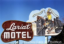 Unfortunately, the sign no longer stands as the motel was razed on February 9, 2005. Fortunately, the Lariat sign was moved to be reinstalled at the Oats Park Arts Center.