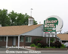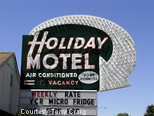 The Holiday Motel features a marquee with a giant arrow