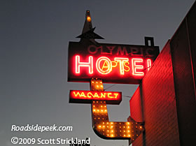 As the golden hour approaches, the sign for the Olympic Hotel begins working its neon magic. Like many other hotel and motels, the Olympic is also home to long term lodging. 10-09