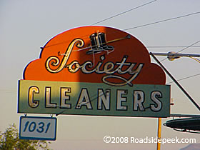 This sign belongs to the Society Cleaners on Fremont Street, located near Atomic Liquors.