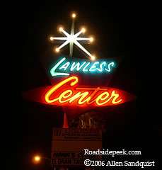 The Lawless Center shopping center sign emits a full neon glow at this Las Vegas center. Check out that sputnk looking lighting atop the sign. 09-06