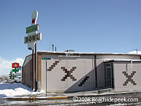 Check out this roadside bowling alley sign at the Holiday Bowl. Located on this main street in Albuquerque, Skidmore's Holiday Bowl is a full feature entertainment center with 32 lanes of bowling, an arcade, restaurant and other features. Here's the official website for Skidmore's Holiday Bowl. 12-10