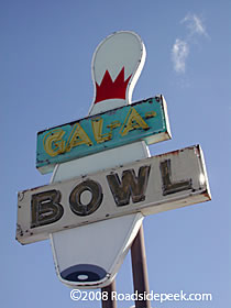 Gallup, NM is home to this old bowling alley called Gala Bowl. See this bowling alley and other neon signs at Roadside Peek'sNeon Bowling New Mexico. 01-09