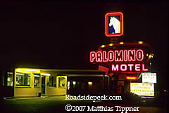 UPDATE 01/07 : This shot of the Palomino Motel marquee was taken in 1996. It shows the newer marquee which replaced the old shown above. 01-07