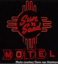 The Sun 'n Sand Motel features a neon marquee that was restored as part of the Route 66 preservation funding. 06-06