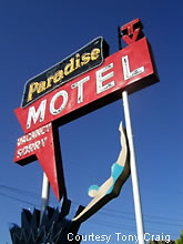 UPDATE 11/20 : The Paradise Motel marquee is now gone and is in the hands of a collector in Wisconsin. The building itself has withstood many fires and is still somewhat standing though burned out on the edge of town.