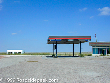 Glenrio, TX is home to these oft photographed gas station structures. Based upon the paint colors, it appears this station is a more modern Texaco station. The Texaco eventually lost its skin which uncovered a Standard/Chevron branding in later years.